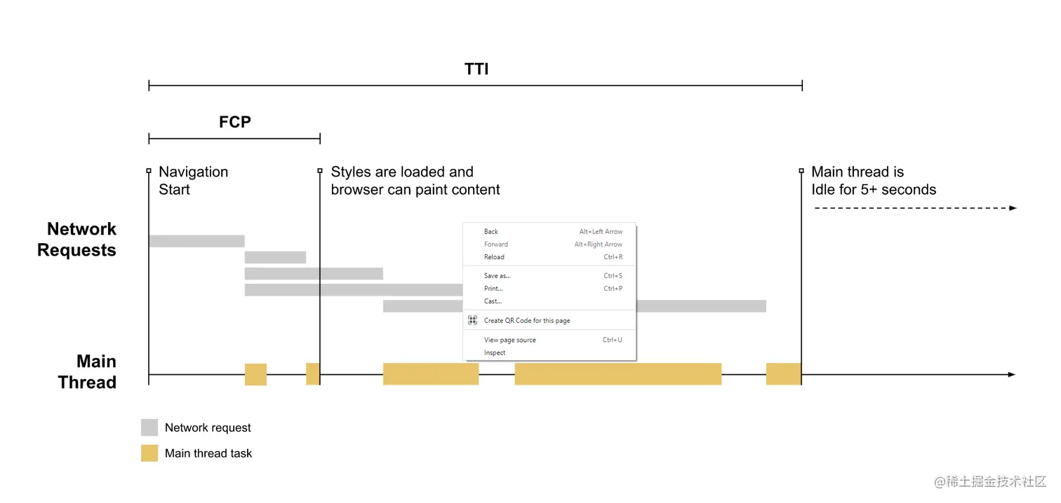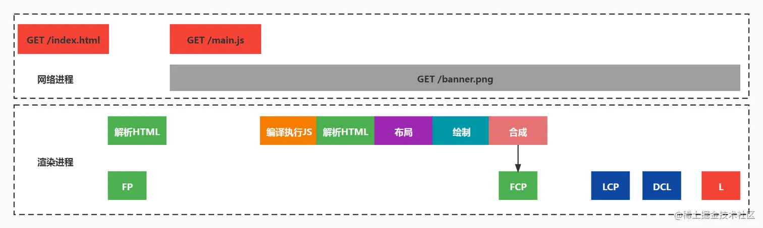 2.FCP First Contentful Paint(首次内容渲染)表示浏览器渲染出第一个内容的时间,这个内容可以是文本、图片或SVG元素等,不包括iframe和白色背景的canvas元素