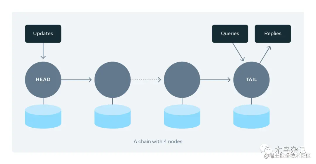 读写流程:所有的写入都在链表头,依照链表顺序复制后,等到链表尾复制完成后返回成功(同步复制);所有的读取都被路由到链表尾,以保证强一致。