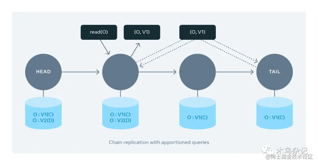 当然,Delta 对读取稍稍做了个优化——分摊查询,即允许客户端读任何一个副本,但该副本必须要和尾节点通信确定数据可靠版本(clean version)后才能返回数据给客户端,以保证一致性。