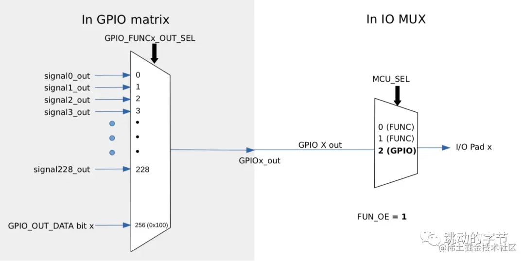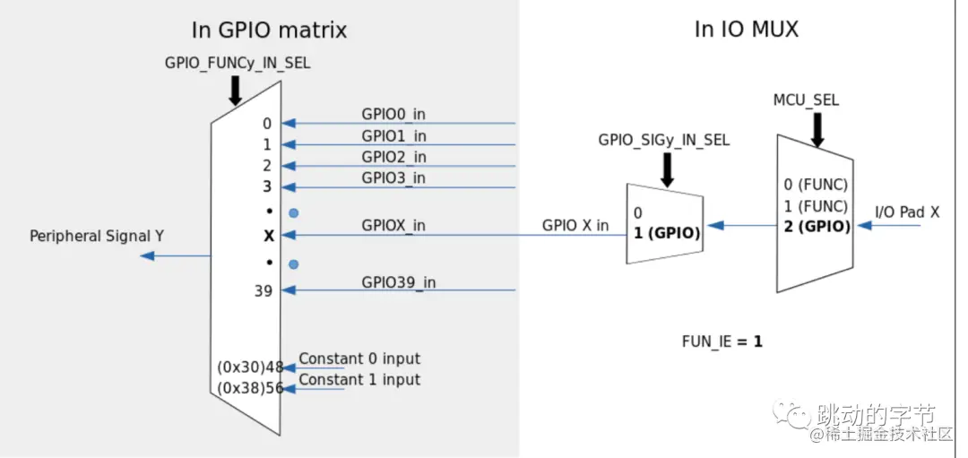 有一些高速信号如以太网、SDIO、SPI、JTAG、UART 等会旁路 GPIO 交换矩阵以实现更好的高频数字特性。所以高速信号会直接通过 IO_MUX 输入和输出,这样比使用 GPIO 交换矩阵的灵活度要低。