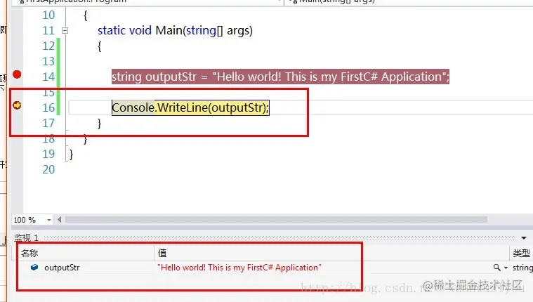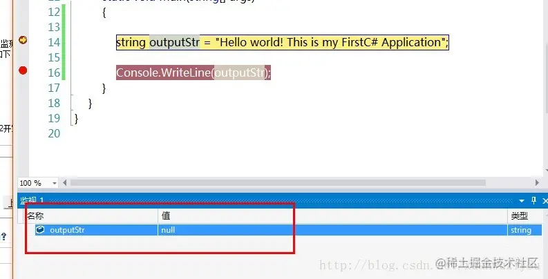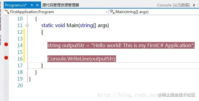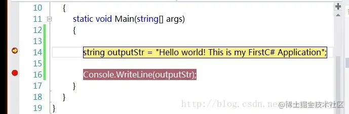 这样就可以控制程序的执行了,如第14行的断点,当执行到此断点时,程序是执行完了14行之前的所有代码,即将执行第14行的代码。