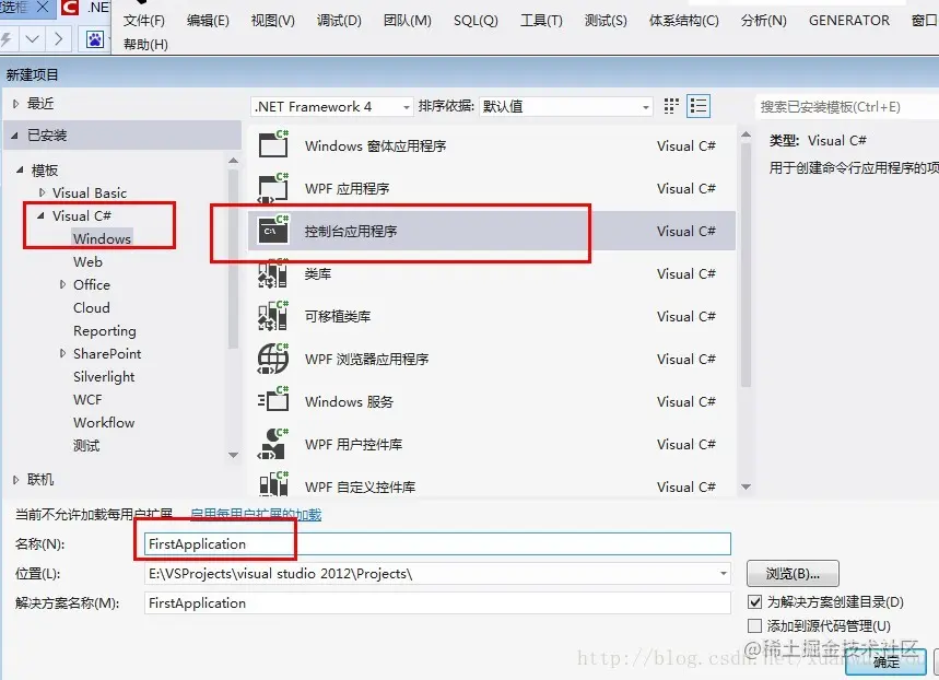 Step1.打开VS2012,新建一个项目,选择VisualC# - 控制台应用程序–起名为FirstApplication,点击确定,如下:
