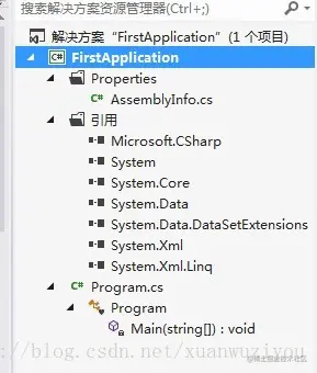 Properties:该文件夹下有一个AssemblyInfo.cs文件,.NET中所有由.cs结尾的文件表示这是一个类文件。该文件可以修改,以保存该项目的所有权,版本号信息等等,我们练习开发时用不到。