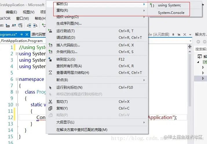 此时,如果项目里的引用中引用了System,则只需要在Console类上右击,点击“解析”,系统就会自动为我们添加using引用,如图: