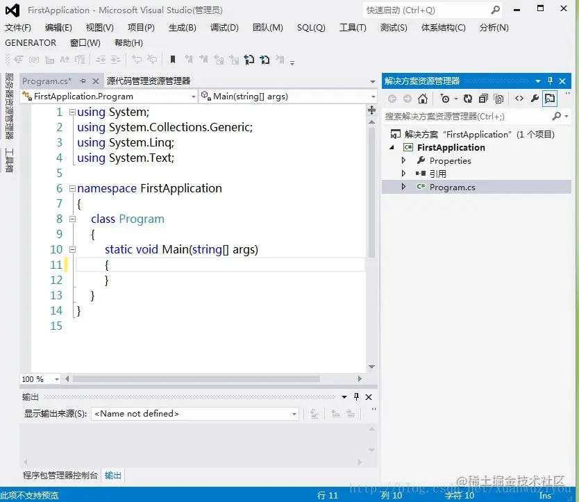 如下图,右侧的部分显示我们新建的项目FirstApplication,同时该项目位于一个系统自动建立的同名解决方案之下。