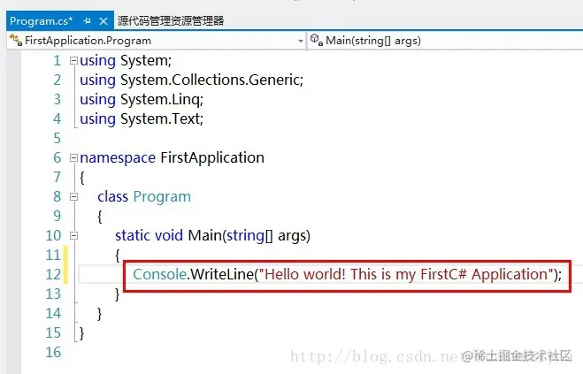 该类的下面一行的紫色小箱子图标表示这是一个方法,这是控制台应用程序的入口方法:Main方法,控制台应用程序就是从这个Main方法开始执行的。