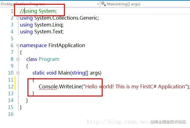 当这样添加了命名空间,有时候程序中还是不能用,因为还需要在程序头部添加using。比如我们现在把usingSystem;注释掉,则程序不能识别Console类了,会报错,如下: