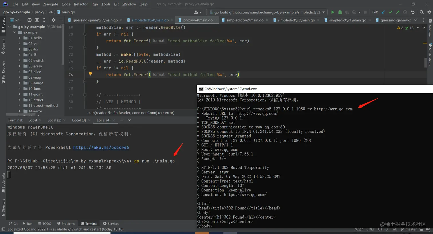 我们先用read bytes来把版本号读出来,然后如果版本号不是socket 5的话直接返回报错,接下来我们再读取method size,也是一个字节。 然后我们需要我们去make一个相应长度的一个slice,用io.ReadFull把它去填充进去。写到这里,我们把获取到的版本号和认证方式打印一下。此时,代理服务器还需要返回一个response,返回包包括两个字段,一个是version一个是method,也就是我们选中的鉴传方式,我们当前只准备实现不需要鉴传的方式,也就是00。我们用curl命令测试一下当前版本的效果