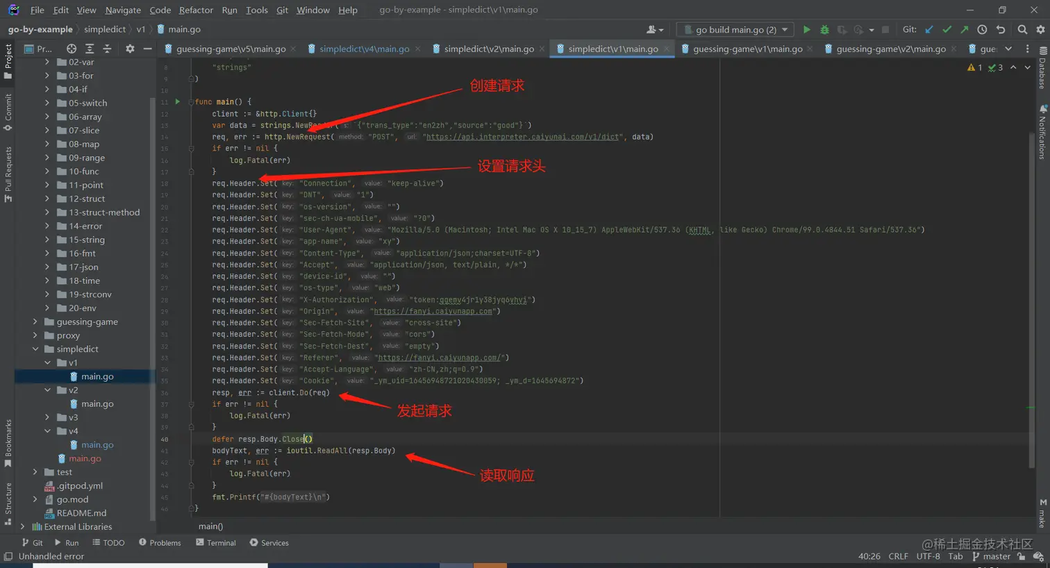 接下来我们开始做第三步,实现请求阶段,我们试图读取到携带URL或者IP地址+端口的包,然后把它打印出来。我们实现一个和 auth函数类似的connect 函数,同样在process里面去调用。再来实现connect函数的代码。 我们来回忆一下请求阶段的逻辑。浏览器会发送一个包, 包里面包含如下6个字段,version 版本号,还是5。command ,代表请求的类型,我们只支持connection请求,也就是让代理服务建立新的TCP连接。RSV 保留字段,不理会。atype 就 是目标地址类型,可能是IPV 4 IPV 6或者域名下面是addr,这个地址的长度是根据atype的类型而不同的port 端口号,两个字节,我们需要逐个去读取这些字段。 面这四个字段总共四个字节,我们可以一-次性把它读出来。我们定) -个长度为4的buffer然后把它读满。读满之后, 然后第0个、 第1个、第3个、分别是version cmd和type,version需要判断是socket5,cmd 需要判断是1。下面的a type,可能是ipv4,ipv6, 或者是host。如果IPV 4的话,我们再次读满这个buffer,因为这个buffer长度刚好也是4个字节, 然后逐个字节打印成IP地址的格式保存到addr变量。 如果是个host的话,需要先读它的长度,再make -个相应长度的buf填充它。再转换成字符串保存到 addr变量。IPV 6用得比较少,我们就暂时先不支持。 最后还有两个字节那个是port,我们读取它,然后按协议规定的大端字节序转换成 数字。由于上面的buffer已经不会被其他变量使用了,我们可以直接复用之前的内存,建立一个临时的 slice,长度是2用于读取,这样的话最多会只读两个字节回来。接下来我们把这个地址和端口打印出来用于调试。收到浏览器的这个请求包 之后,我们需要返回一个包,这个包有很多字段,但其实大部分都不会使用。 第一个是版本号还是socket5。第 二个, 就是返回的类型,这里是成功就返回0第三个是保留字段填0第四个atype地址类型填1第五个,第六个暂时用不到, 都填成0。一 共4+4+2个字节,后面6个字节都是0填充。