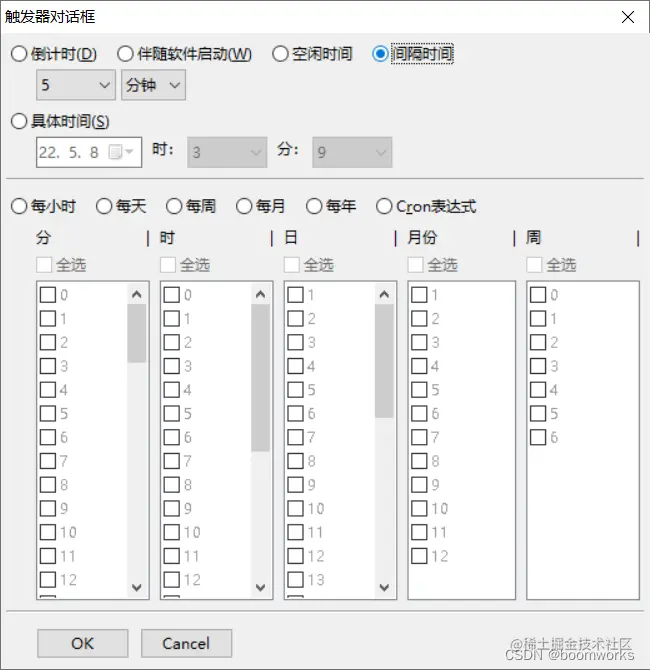 - 在触发器对话框选择“间隔时间”,比如:选择间隔每 5分钟执行 1次;