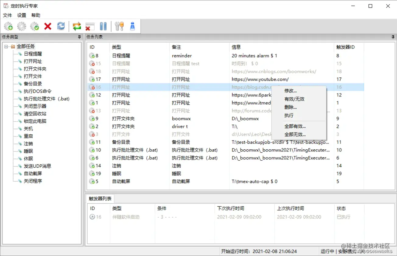 《定时执行专家》是一款制作精良、功能全面、使用简单的专业定时任务执行软件。支持 18 种任务类型,11 种任务触发方式(包含 Cron方式),触发精度达到“毫秒”级。软件无需安装,无使用时间限制,欢迎下载使用。软件使用 Unicode 编码,可以在英文、日文等所有外文 Windows 系统下正常使用,并且软件带有中、日、英多国语言界面版本,可自由切换。