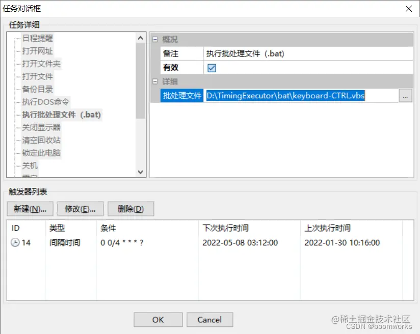- 在任务对话框左侧选择“执行批处理文件(.bat)”,在右侧选择要执行批处理文件(请选择本程序自带的 keyboard-CTRL.vbs);