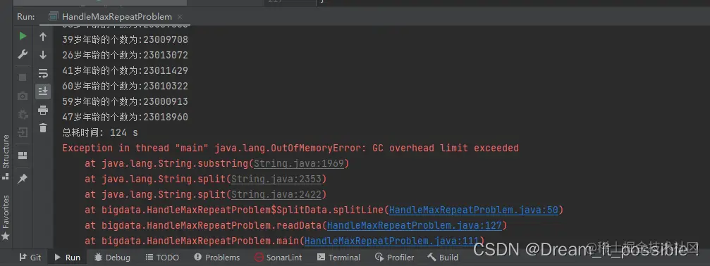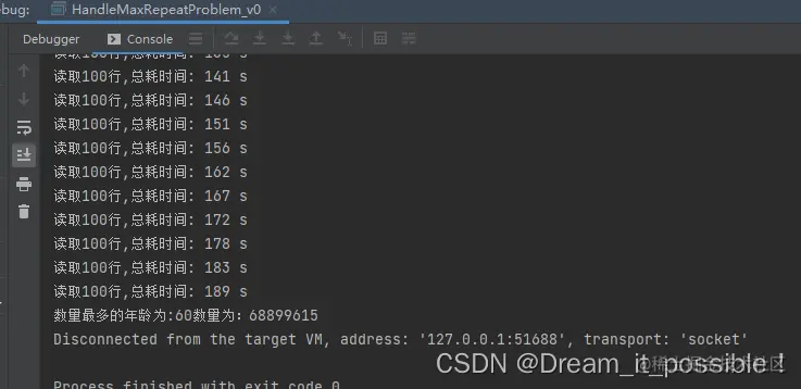 通过单线程处理,初始化一个countMap, key为年龄,value为出现的次数, 将每行读取到的数据按照"," 进行分割,然后获取到的每一项进行保存到countMap里,如果存在,那么值key的value+1。