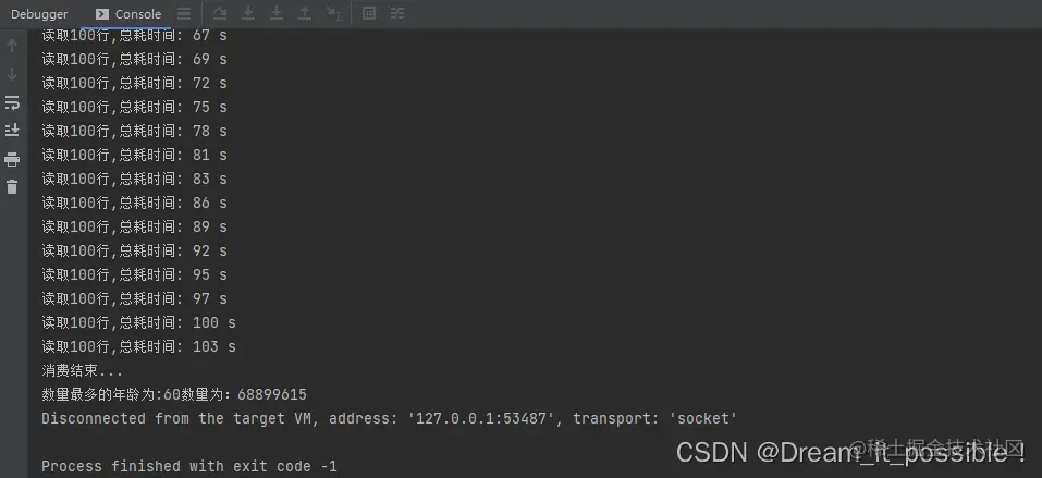 System.out.println("读取100行,总耗时间: " + (System.currentTimeMillis() - start) / 1000 + " s");