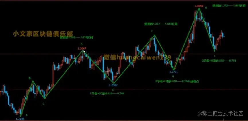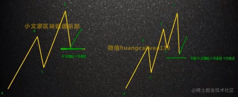 - 上图当 EF 的上涨小于 CD 的上涨,并且 F 遇到关键阻力,往往回撤都会打到 E 点下方位置