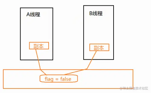 如图,JMM内存模型中,每一个线程都有一个高速缓冲区,这个区域是每个线程自己独有的内存空间,flag其实在主内存中,每个线程是拷贝了一个flag副本到自己的内存。