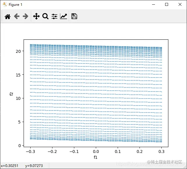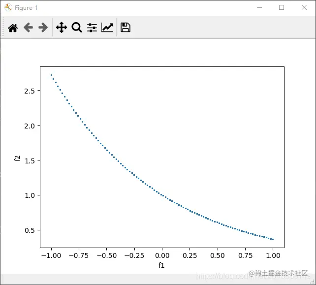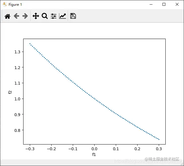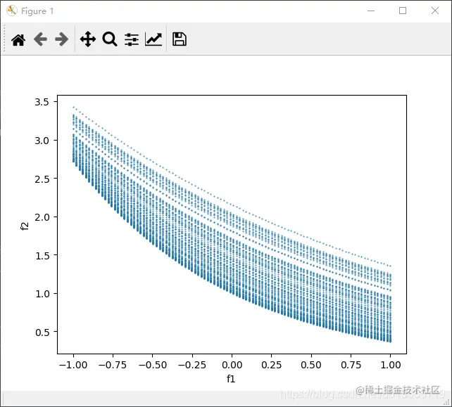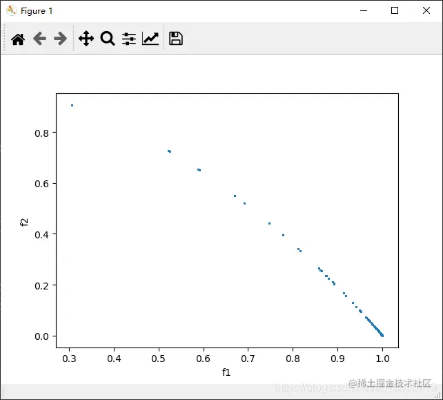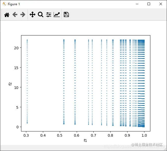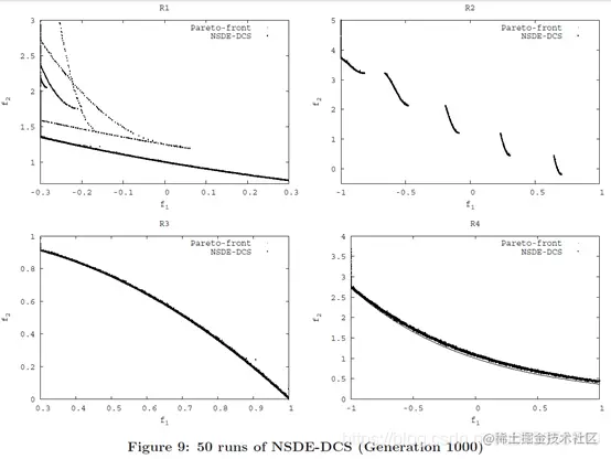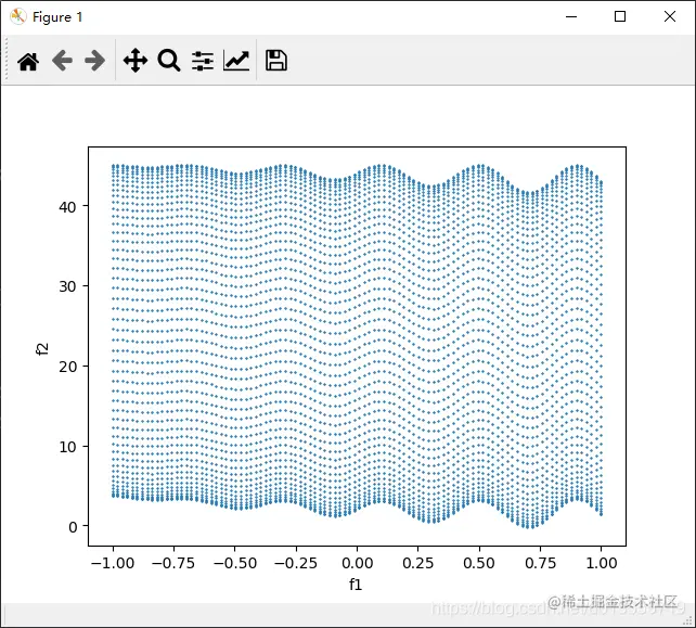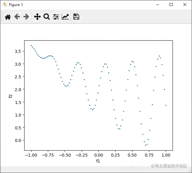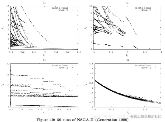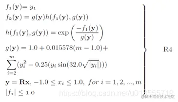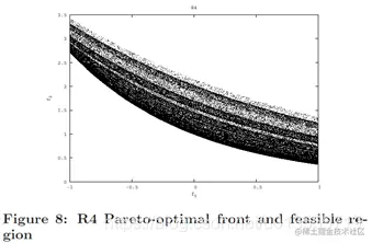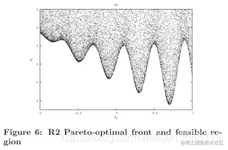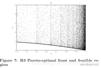 - 决策空间变量有规则的递增,但在问题R3的目标空间中以非规则的间隔进行求值,因此很难沿着帕累托最优前沿找到均匀分布。解的密度越低,则f1值越低。问题R3与ZDT6问题类似。f1和f2是非线性函数。g函数在指定范围内不是多模态的。此问题的可行空间和帕累托最优前沿如图7所示。