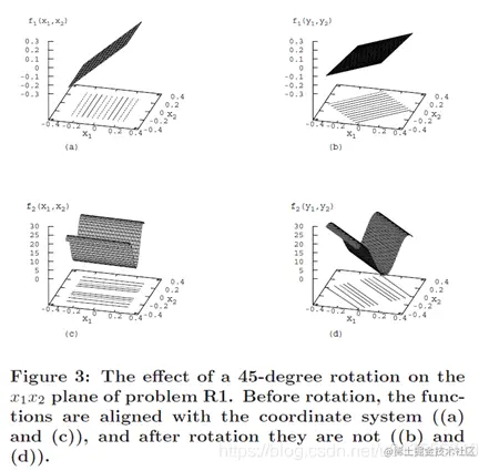 - 在本节中,介绍了四个旋转的测试问题。这些问题可以在决策空间中任意旋转。这些问题中的每一个都具有至少一个非线性的目标,并且可以通过旋转坐标系来引入参数交互作用。