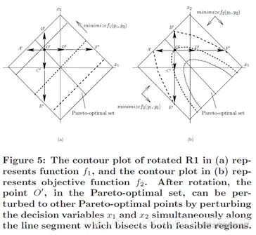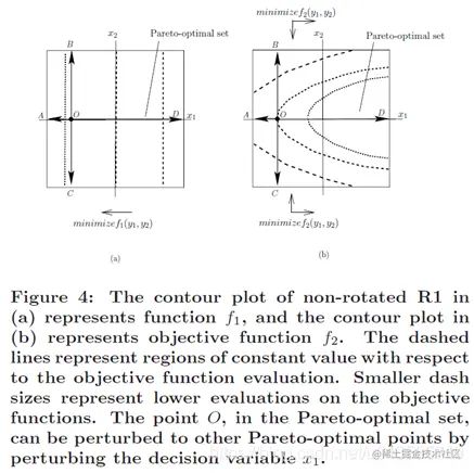 尽管可以直观地期望在多目标域中遇到的情况是相同的,但是情况并不是那么简单。 为了突出旋转的单目标问题和多目标问题之间的区别,我们将考虑一个简单的多目标问题。 这也将有助于我们理解旋转对多目标问题的影响,在该问题中,搜索算法会寻找非主导解集。 这种情况类似于单个目标域,在该域中,对每个决策变量具有独立扰动的搜索算法将很难找到更多的最优解。