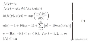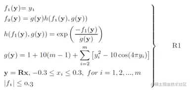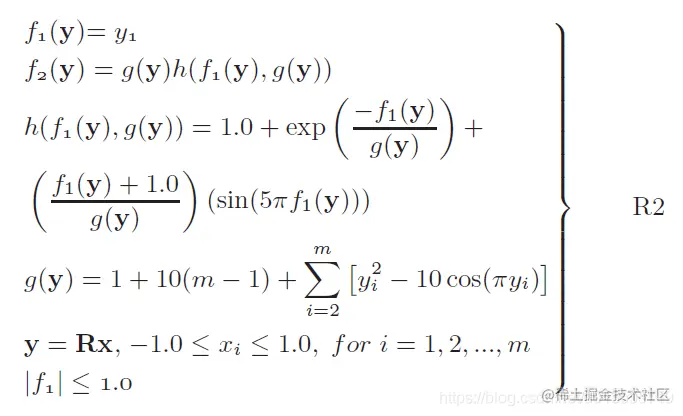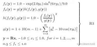 - 问题R1由Deb [1]首先提出。它的特征是在目标f2中有一个谷。帕累托最优集也沿着该谷的长度分布,并且当问题受到旋转时,该谷可以捕获沿其进行的非旋转不变搜索,如第2.1节中所述。函数f1是线性的。