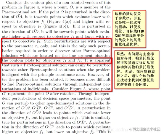 实际上,此分析所基于的图3中的问题相对于可行空间具有非常小的区域,其中非支配解可以位于O C和O D方向。在这些方向上非支配的解决方案仅随着问题的方向接近与主坐标轴对齐的可能性而变得越来越可能。当帕累托最优前端的方向与轴x1对齐时,线矢量O C进一步延伸,因此可以在该区域中更容易地发现更多非支配解。其次,这样的非支配解将接近帕累托最优集。对于线向量O D同样如此,因为帕累托最优前端与轴x2对齐。换句话说,导致帕累托最优集不与任何主坐标轴对齐的问题的旋转,使得当仅出现决策变量的独立扰动时,很难发现其他帕累托最优解。