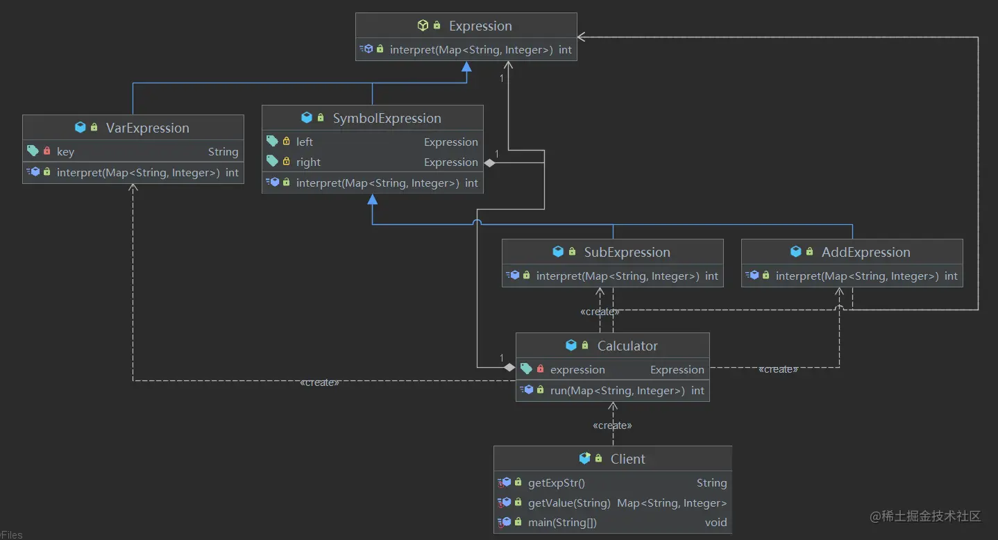 - 2)解释器模式(Interpreter Pattern):是指给定一个语言(表达式),定义它的文法的一种表示,并定义一个解释器,使用该解释器来解释语言中的句子(表达式)
