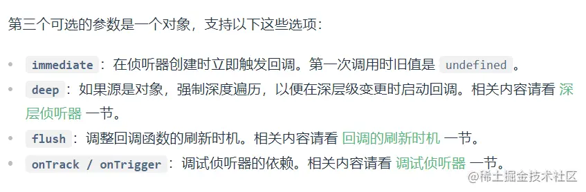 虽然VUE 3的数据监听底层机制改用了proxy并作了很多的新优化,但与VUE2 相同的是,VUE 3的watch本质上也是基于数据响应的机制实现的。所以在默认场景下watch的触发也会有上面我们讨论的问题,但在VUE3中官方给出了解决办法。VUE3中给watch新增了一些配置: