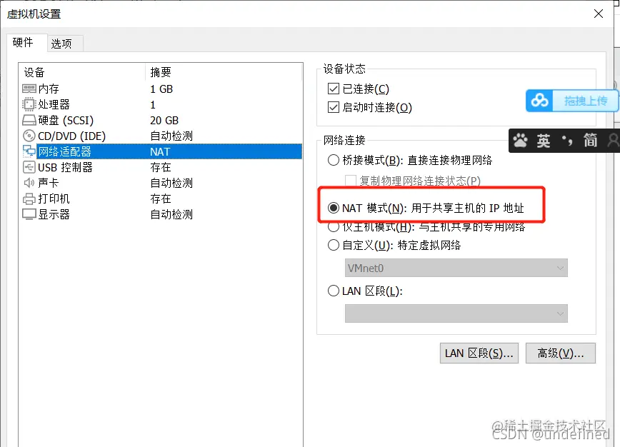 1、右击虚拟机->虚拟机设置->网络设配器设置为NET模式,默认应该就是这个,是的话就不用修改了。