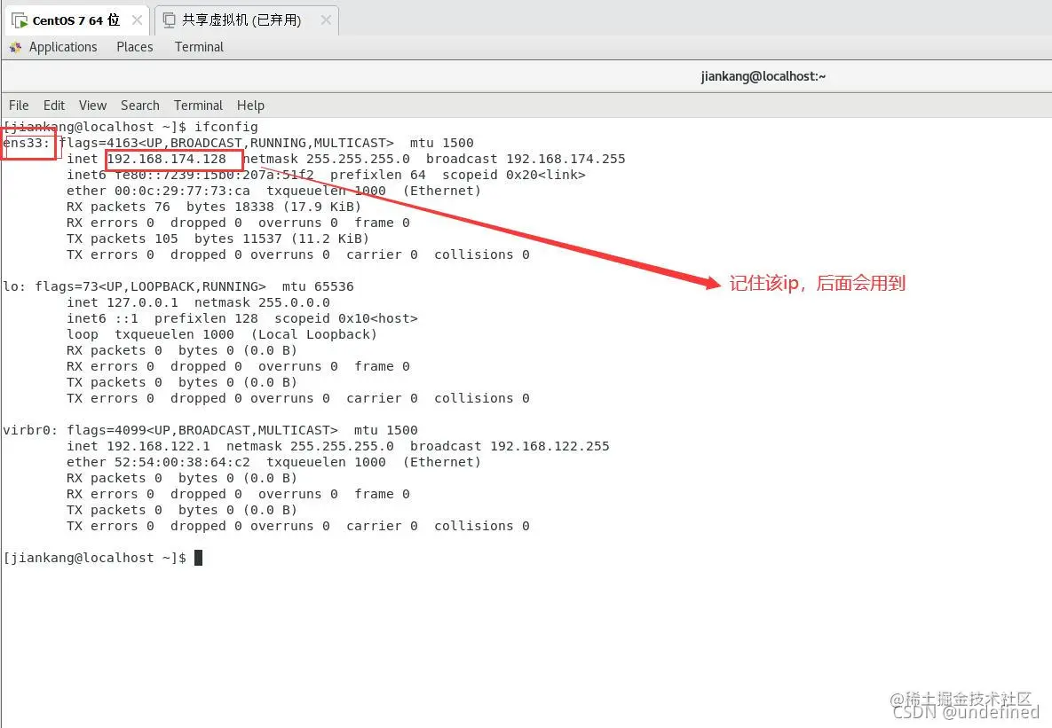 (2)记住ens33的ip复制到其他地方,后面配置会用到。
