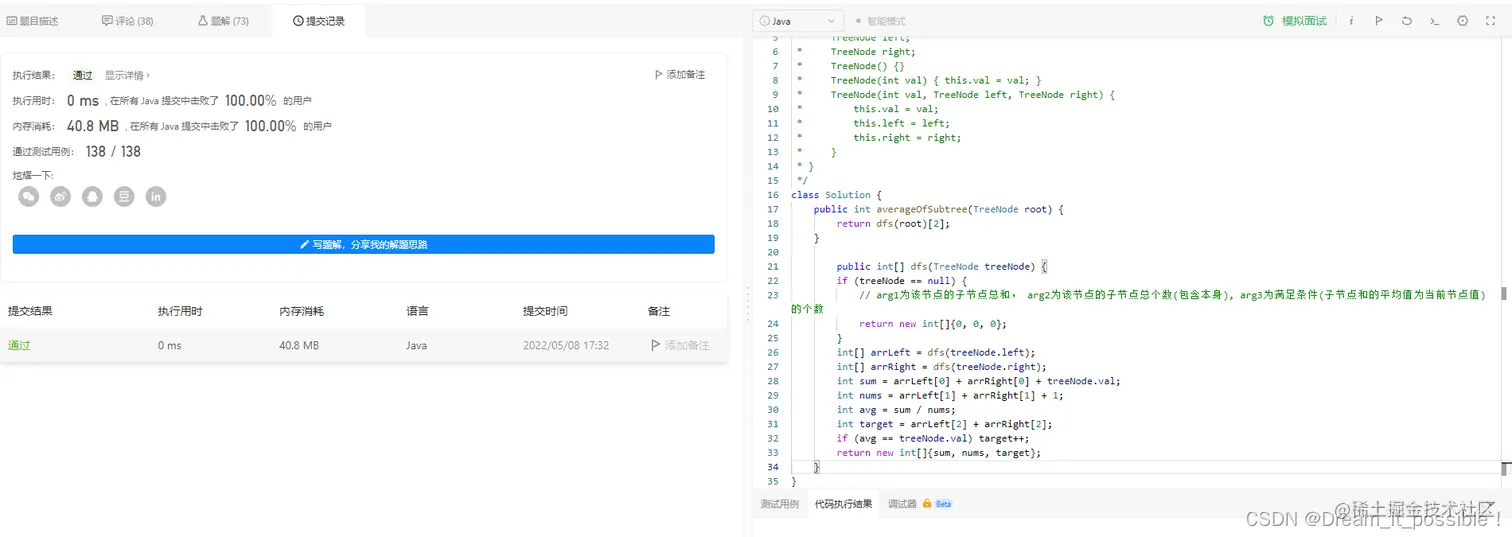 给你一棵二叉树的根节点 root ,找出并返回满足要求的节点数,要求节点的值等于其 子树 中值的 平均值 。
