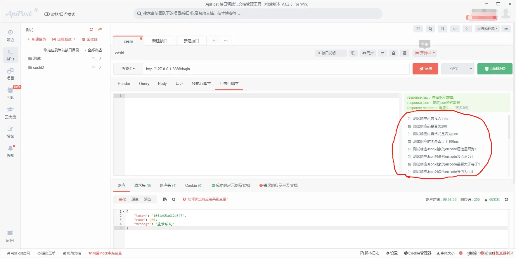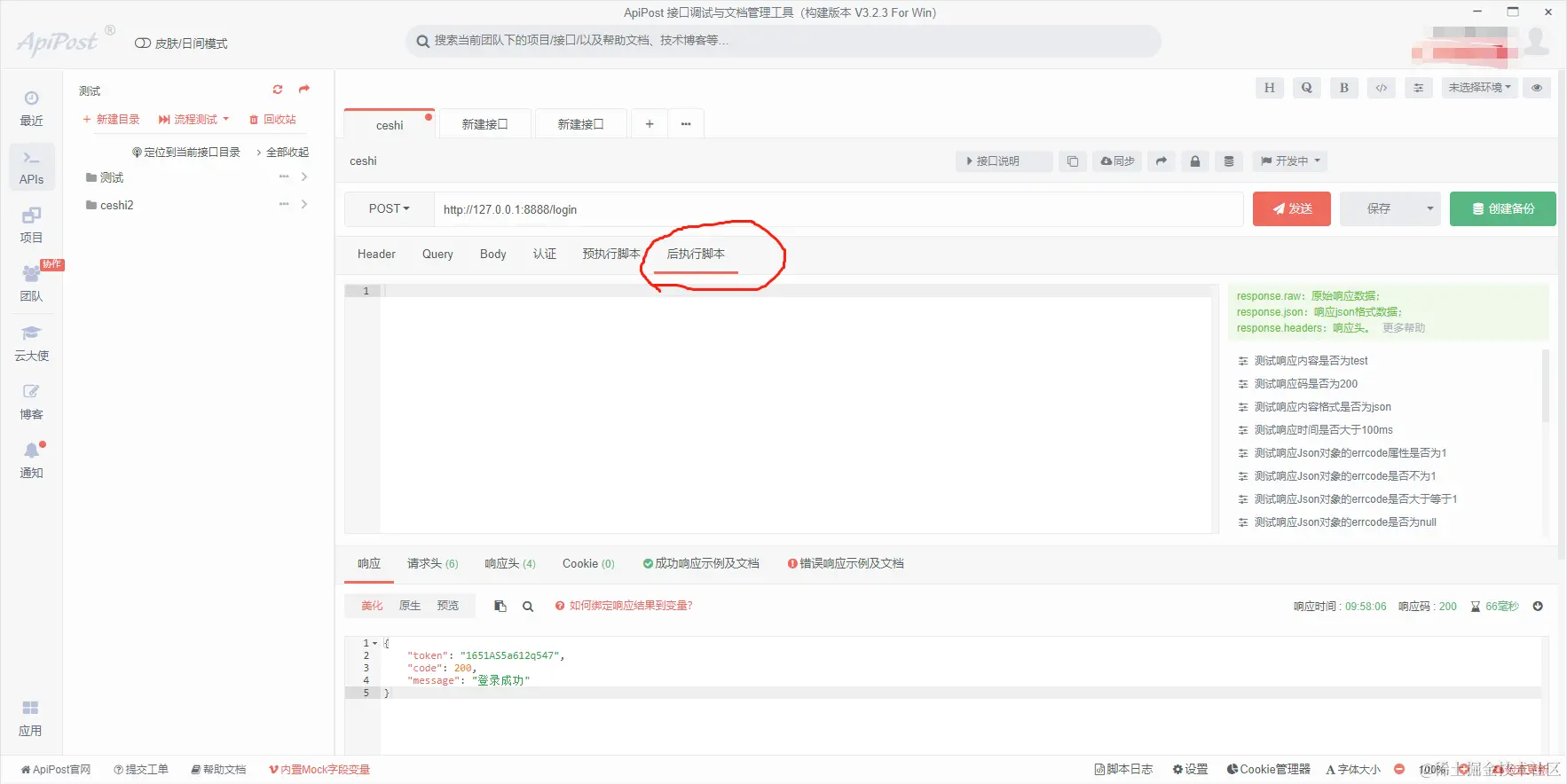 找到 apipost 的后执行脚本,点击进入后执行脚本功能。