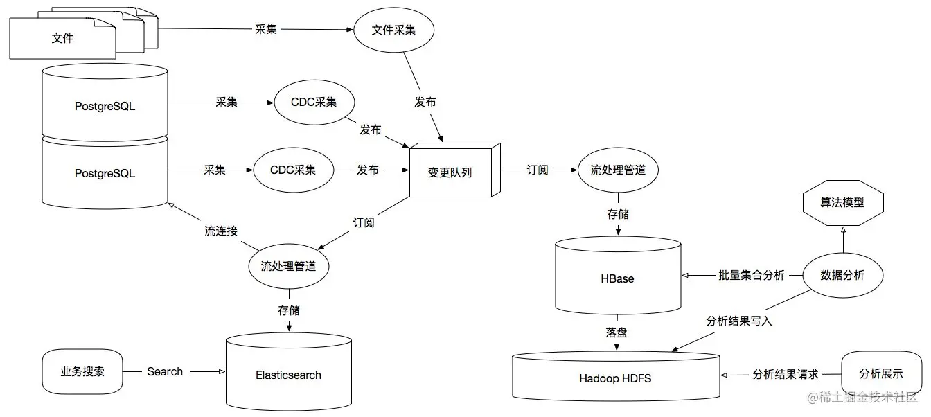 在大数据中非常重要起点就是对于数据的采集,一般大数据主流程不会直接从用户端的请求服务中进行计算,我们将这个领域定位为OLTP,也就是由传统数据库或支撑海量数据写入的NoSQL来完成,然后我们通过采集工具从RDBMS、文件或NoSQL中进行采集同步,例如上图中:利用CDC(数据变更捕获),我们可以从PostgreSQL的逻辑复制中捕获WAL(预写日志文件)的数据变更,然后将变更数据发送到大数据平台,也可以从文件中采集获取,常见的采集工具有ELK的Filebeat、Logstash采集文件,Flume作为多源采集管道并集成HDFS,Canal采集MySQL Binlog,Flink CDC采集PostgresSQL WAL等。