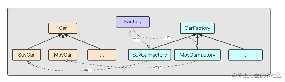 - 抽象工厂生产的是「能生产汽车的生产线」