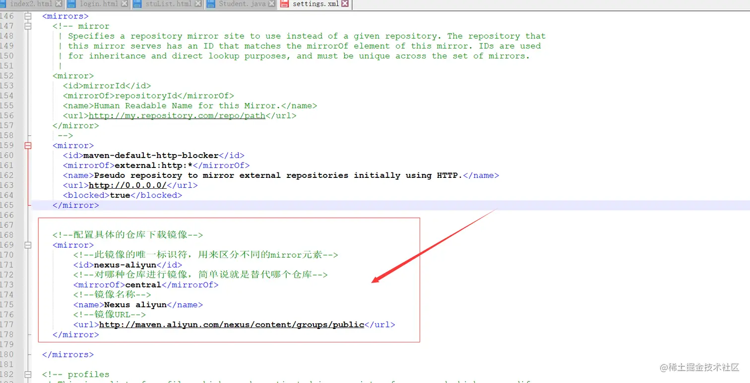 <mirrors> <!--配置具体的仓库下载镜像--> <mirror> <!--此镜像的唯一标识符,用来区分不同的mirror元素--> <id>nexus-aliyun</id> <!--对哪种仓库进行镜像,简单说就是替代哪个仓库--> <mirrorOf>central</mirrorOf> <!--镜像名称--> <name>Nexus aliyun</name> <!--镜像URL--> <url>http://maven.aliyun.com/nexus/content/groups/public</url> </mirror> </mirrors>修改配置后别忘了替换本地仓库中的setting文件