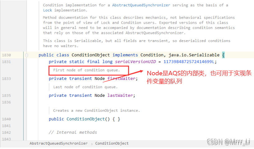 - 提供了基于 FIFO 的等待队列来实现阻塞队列,类似于 Monitor 的 EntryList。**有一个Node内部类,用来实现FIFO的等待队列 。后续讲ReentrantLock实现原理时,会具体介绍。**