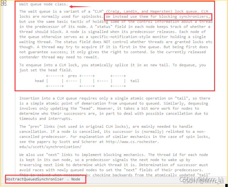 - 关于同步队列,参考这篇博客。[这篇博客https://blog.csdn.net/luzhensmart/article/details/105771974?ops_request_misc=&request_id=&biz_id=&utm_medium=distribute.pc_search_result.none-task-blog-2~all~es_rank~default-10-105771974.pc_search_all_es&utm_term=CLH+%E9%98%9F%E5%88%97&spm=1018.2226.3001.4187https://blog.csdn.net/luzhensmart/article/details/105771974?ops_request_misc=&request_id=&biz_id=&utm_medium=distribute.pc_search_result.none-task-blog-2~all~es_rank~default-10-105771974.pc_search_all_es&utm_term=CLH+%E9%98%9F%E5%88%97&spm=1018.2226.3001.4187](https://blog.csdn.net/luzhensmart/article/details/105771974?ops_request_misc=&request_id=&biz_id=&utm_medium=distribute.pc_search_result.none-task-blog-2~all~es_rank~default-10-105771974.pc_search_all_es&utm_term=CLH+%E9%98%9F%E5%88%97&spm=1018.2226.3001.4187 "这篇博客https://blog.csdn.net/luzhensmart/article/details/105771974?ops_request_misc=&request_id=&biz_id=&utm_medium=distribute.pc_search_result.none-task-blog-2~all~es_rank~default-10-105771974.pc_search_all_es&utm_term=CLH+%E9%98%9F%E5%88%97&spm=1018.2226.3001.4187")