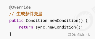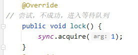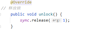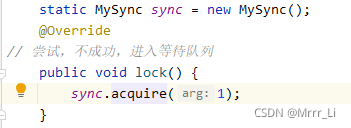 class MyLock implements Lock { static MySync sync = new MySync(); @Override // 尝试,不成功,进入等待队列 public void lock() { sync.acquire(1); //acquire方法是AQS的方法 } @Override // 尝试,不成功,进入等待队列,可打断 public void lockInterruptibly() throws InterruptedException { sync.acquireInterruptibly(1); } @Override // 尝试一次,不成功返回,不进入队列 public boolean tryLock() { return sync.tryAcquire(1); } @Override // 尝试,不成功,进入等待队列,有时限 public boolean tryLock(long time, TimeUnit unit) throws InterruptedException { return sync.tryAcquireNanos(1, unit.toNanos(time)); } @Override // 释放锁 public void unlock() { sync.release(1); } @Override // 生成条件变量 public Condition newCondition() { return sync.newCondition(); } }