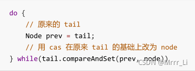 private Node enq(final Node node) { for (;;) { Node t = tail; // 队列中还没有元素 tail 为 null if (t == null) { // 将 head 从 null -> dummy if (compareAndSetHead(new Node())) tail = head; } else { // 将 node 的 prev 设置为原来的 tail node.prev = t; // 将 tail 从原来的 tail 设置为 node if (compareAndSetTail(t, node)) { // 原来 tail 的 next 设置为 node t.next = node; return t; } } } }