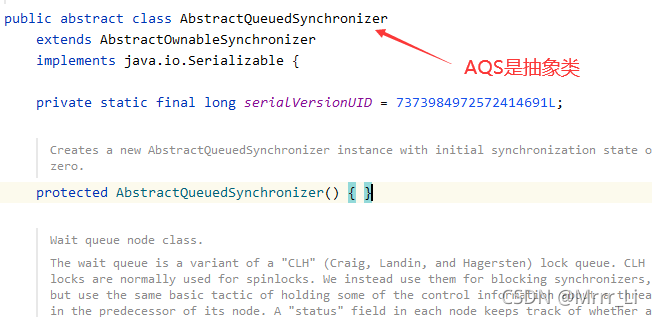 **AQS是个抽象类。AQS及其实现类,类似于Monitor。看下面第二条和第三条。但是Monitor是不可见的,是操作系统提供的。AQS是Java通过CAS和volitile实现的类似于Monitor的同步器。**