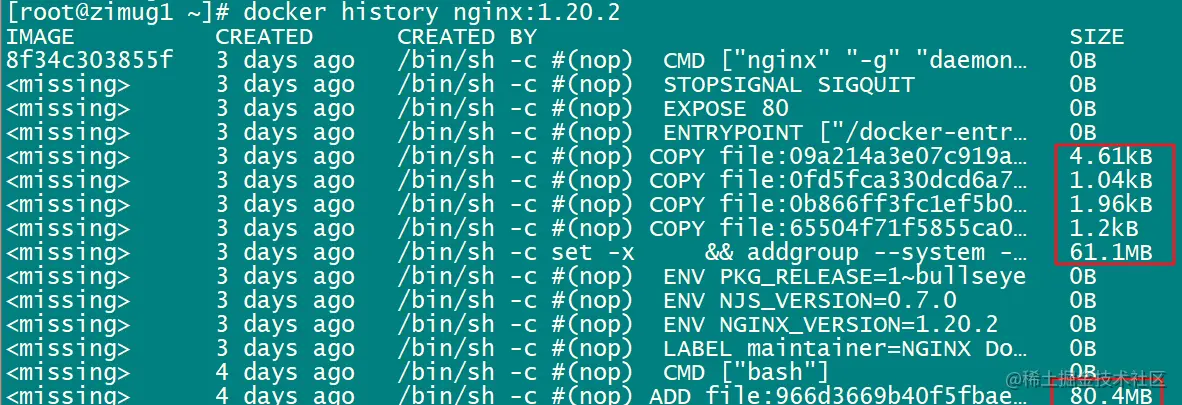 注意上图中红色边框的部分,我们可以看到:在进行ADD、COPY、执行shell脚本等操作的时候操作步骤对应的SIZE不等于0,正好是6个操作,和我们上文中nginx:1.20.2镜像分层的数量是一样的。所以我们可以做一个大胆的猜想:在镜像构建过程中需要向镜像写入数据的时候会产生分层,一个写操作指令产生一个分层。 大家可以自己去观察更多的镜像去验证这个猜想。笔者要说的是:我读过Dokcer的源码,所以这是一个可以被信任的结论。