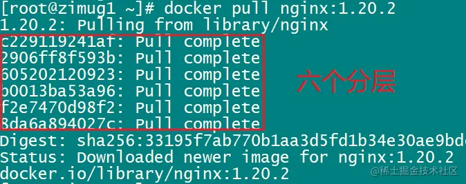 在进行docker pull 下载镜像的时候,通过下图可以看到镜像是分层下载并解压的。如nginx:1.20.2的镜像,其镜像是分为6层。