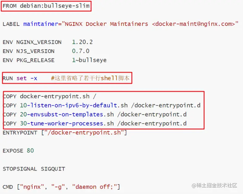 上面的这张图是nginx:1.20.2的Dockerfile(镜像构建过程定义文档),也就是构建nginx:1.20.2镜像的构建步骤定义文档(官方)。其中FROM(ADD)指令--添加基础镜像或文件、RUN指令--执行命令行脚本、COPY指令--文件复制,这些都是写操作命令,都会产生新的镜像分层。