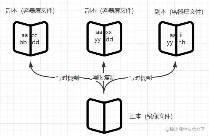 老师的练习册是原始文稿(正本)(原始文稿构建之后就只读不写,镜像层文件也是),同学们的练习册是在需要使用到的时候复印出来的,并在复印本(副本)上完成作业书写,不影响原来老师那本练习册(正本)的内容。这个就是典型的“写时复制”。 对于容器而言,复制出来的文件在面向容器内的运行时软件时,会覆盖原始镜像文件(对于学生而言也只看自己复制出来那份--不要抬杠:抄作业的除外,不看老师的原始文件)。也就是说发生写时复制之后原始镜像文件被隐藏,容器读写操作都只认复制出来的副本文件。注意:该副本文件存在于容器层,容器重启之后容器层重新建立,上一次容器运行时对于文件的修改全部丢失!