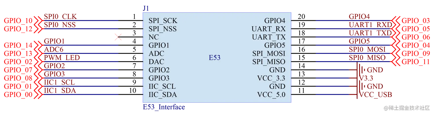 使用板载 E53 接口的 UART 作为测试,如原理图所示第 18 和 19 脚分别为 TXD 和 RXD ,连接了主控芯片的 GPIO_6 和 GPIO_5 ,所以在编写软件的时候需要将 GPIO_6 和 GPIO_5 分别复用为 TXD 和 RXD 。