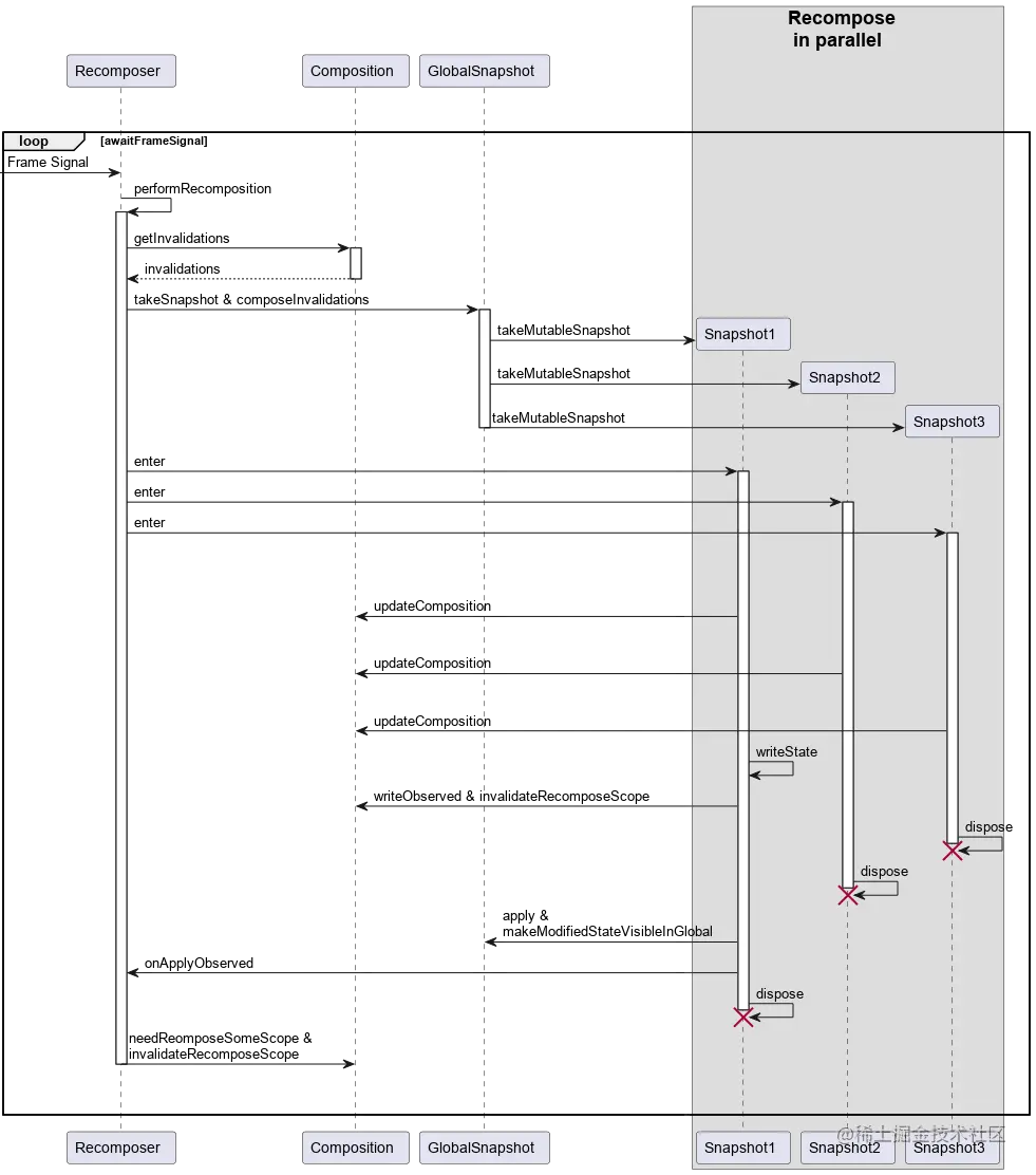 - 当帧信号达到时,Recomposer 查找 invalid 的 Scope,获取空闲子线程并创建快照,在快照上执行 Scope 代码