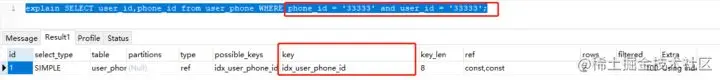 优化器的作用就是根据MySQL的规则让你的SQL执行效率跟高,本例中建立的联合索引是(user_id,phone_id),查询条件是phone_id = ? and user_id = ?,根据最左前缀原理,这条SQL是不会走索引的。我们通过Explain来看下是否走了索引。