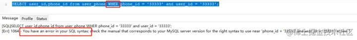 分析器主要是分析SQL是否符合MySQL规则,简单理解就是,这条SQL是否可以在MySQL中执行。平时我们看到的语法错误,大部分来自于分析器。比如上述SQL中,where 写成 wher 就会出现以下错误: