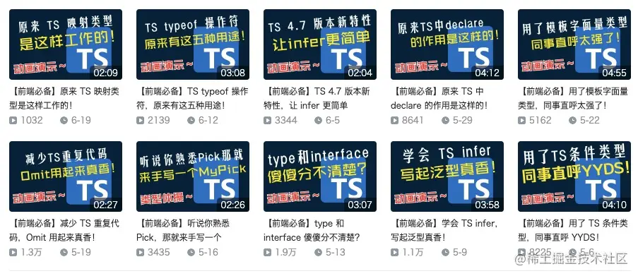 阿宝哥精心准备的 《轻松学 TypeScript》 视频教程来咯,强烈推荐!通过形象生动的动画,让你轻松搞懂 TypeScript 的难点和核心知识点!目前已更新到第 19 期,其中 1 期的观看量已破 2 W,该合集的播放量目前已达 14.4W+🔥🔥🔥。