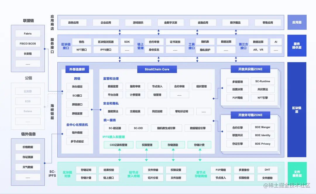 区块链层由核心链、“开放共识链ZONE”、“开放许可链ZONE”以及外部连接桥组成。区块链层是整个海峡链最核心的部分,负责各项核心工作包括:链上治理、数据监管、合约审核、计费管理等。