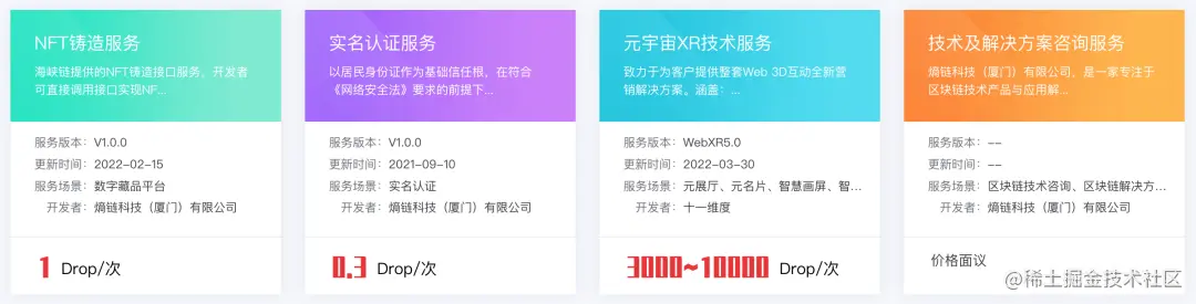 海峡链为应用开发者提供了成熟的区块链智能合约模板与技术服务解决方案。开发者通过简单的API调用,即可实现包括NFT藏品铸造、实名认证、数字藏品VR展示等Dapp开发过程中常用基础功能的接入,帮助开发者提高开发效率。目前,海峡链服务市场已为开发者提供了“NFT铸造服务”、“实名认证服务”、“元宇宙 XR 技术服务”、“技术及解决方案咨询服务”等成熟的服务。